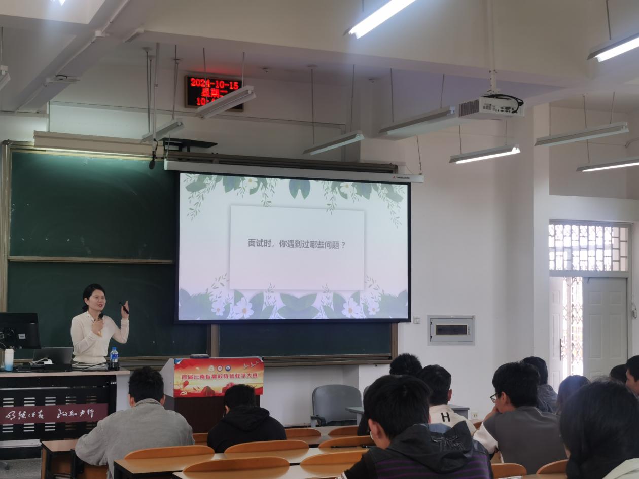 为进一步推进我系2025届毕业生就业工作,引导学生做好就业准备,掌握简历制作、面试礼仪技巧,我系结合实际,于10月15日10:30在西北教学楼B401教室开展“求职有道 非‘理’莫属”就业指导主题讲座。讲座由银鹏科技有限公司人力资源部陈雪萍经理主讲。
