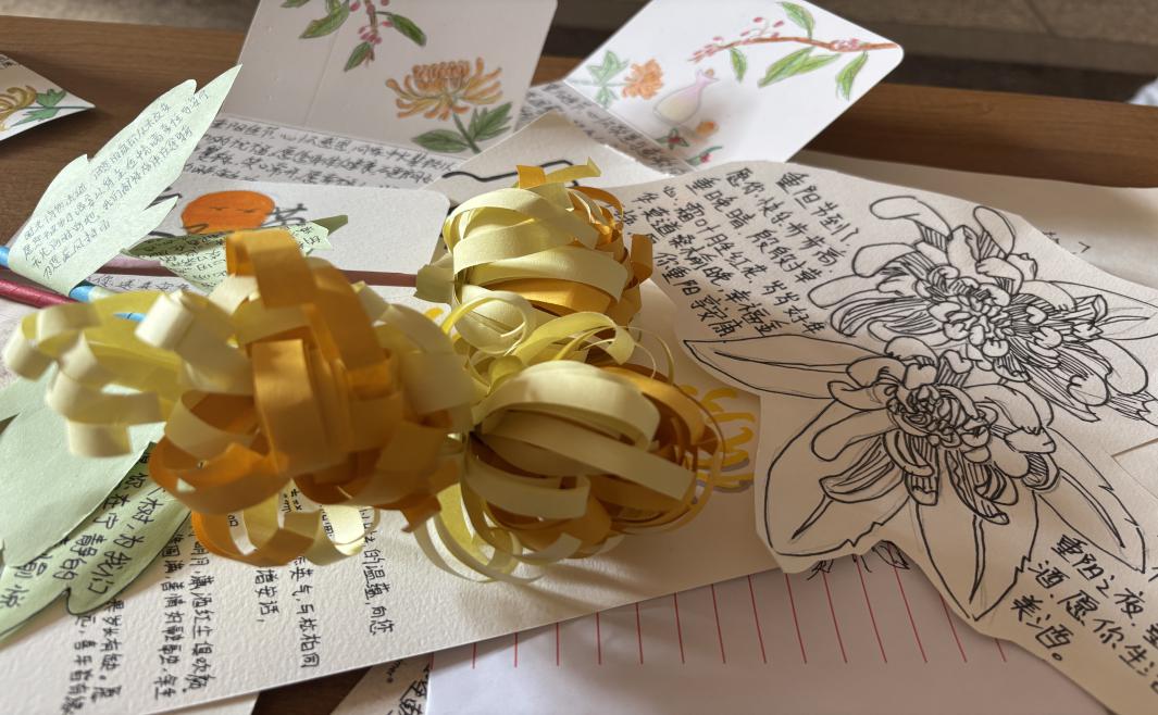 活动开展过程中,同学们尽情施展自己的创意与才华,巧妙运用折纸艺术和绘画技巧,亲手制作关于重阳节的手工贺卡。有的用彩纸精心折叠出花朵、千纸鹤、爱心等各式各样的精美形状;有的则挥动画笔,在贺卡上细腻地描绘出秋菊的淡泊高雅、桂花的精致细腻以及山川的雄伟壮丽,每一笔都饱含着对长辈的深情厚谊。在每一张贺卡上,同学们都真挚地写下对长辈的温馨祝福,言语简单却充满了深厚的爱意。