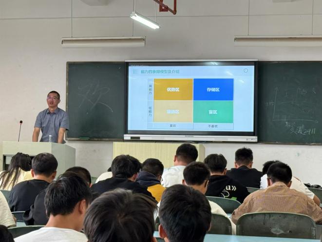 同时,陈老师特别强调了个人能力与职业发展之间的密切关系。他通过“优势区、存储区、潜能区、盲区”这一独特的模型,引导同学们进行自我认知,明确自身的优势和不足,建议同学们制定能力提升计划,通过持续学习、实践应用、请教分享、刻意练习以及技能迁移等方式,不断提升自己的个人能力,构建核心竞争力。