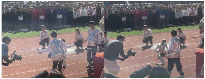 当日上午,随着各班级方阵与表演队伍依次退场,跑道中央瞬间成为全场目光的汇聚点。昆明理工大学人工智能协会带来的 “科技天团” 迈着整齐划一的步伐登场:两只机器狗姿态矫健,每一步都精准有力,金属外壳在阳光下熠熠生辉;宇树机器人身形灵活,动作流畅自然,三者同步行进的画面极具视觉冲击力。同学们纷纷起身欢呼,拿出手机记录这新奇场景,现场快门声与欢呼声交织在一起。